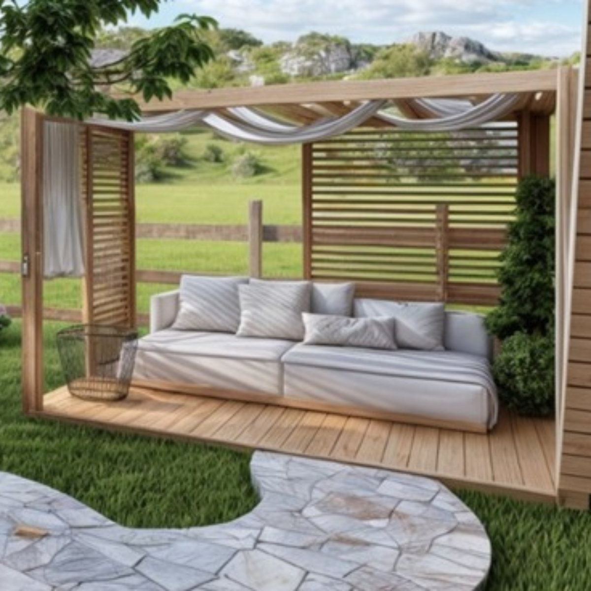 Con sus 8m², esta área de descanso es el equilibrio perfecto entre espacio compacto y funcionalidad. Es ideal para instalar un juego de muebles de exterior, una hamaca, o incluso plantas decorativas que complementen tu estilo personal. Ya sea para momentos de relax o para celebrar pequeñas reuniones al aire libre, este producto te permitirá aprovechar al máximo tu espacio exterior.